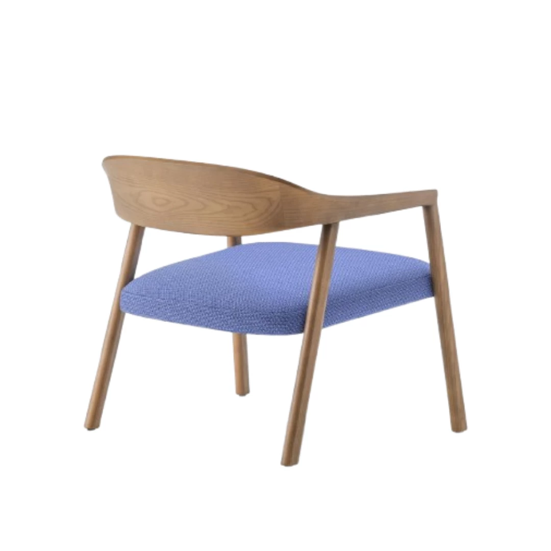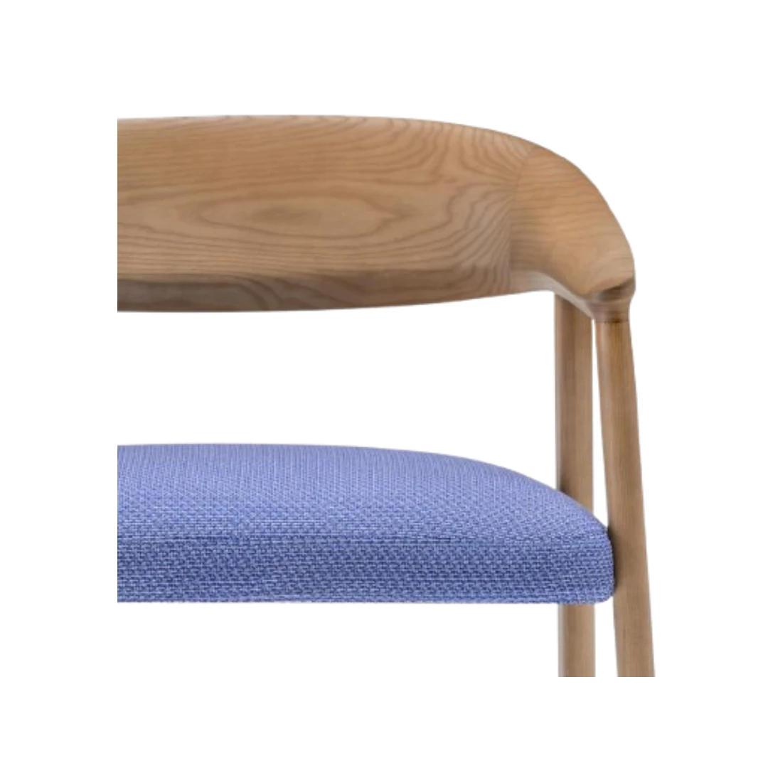Héra 2869 is an indoor lounge armchair in ash wood, featuring a sculptural wrap-around solid back that flows into rounded rectangular legs. Its seat, padded with flexible polyurethane foam and supported by elastic straps, offers lasting comfort—an elegant, durable choice for refined restaurant spaces.