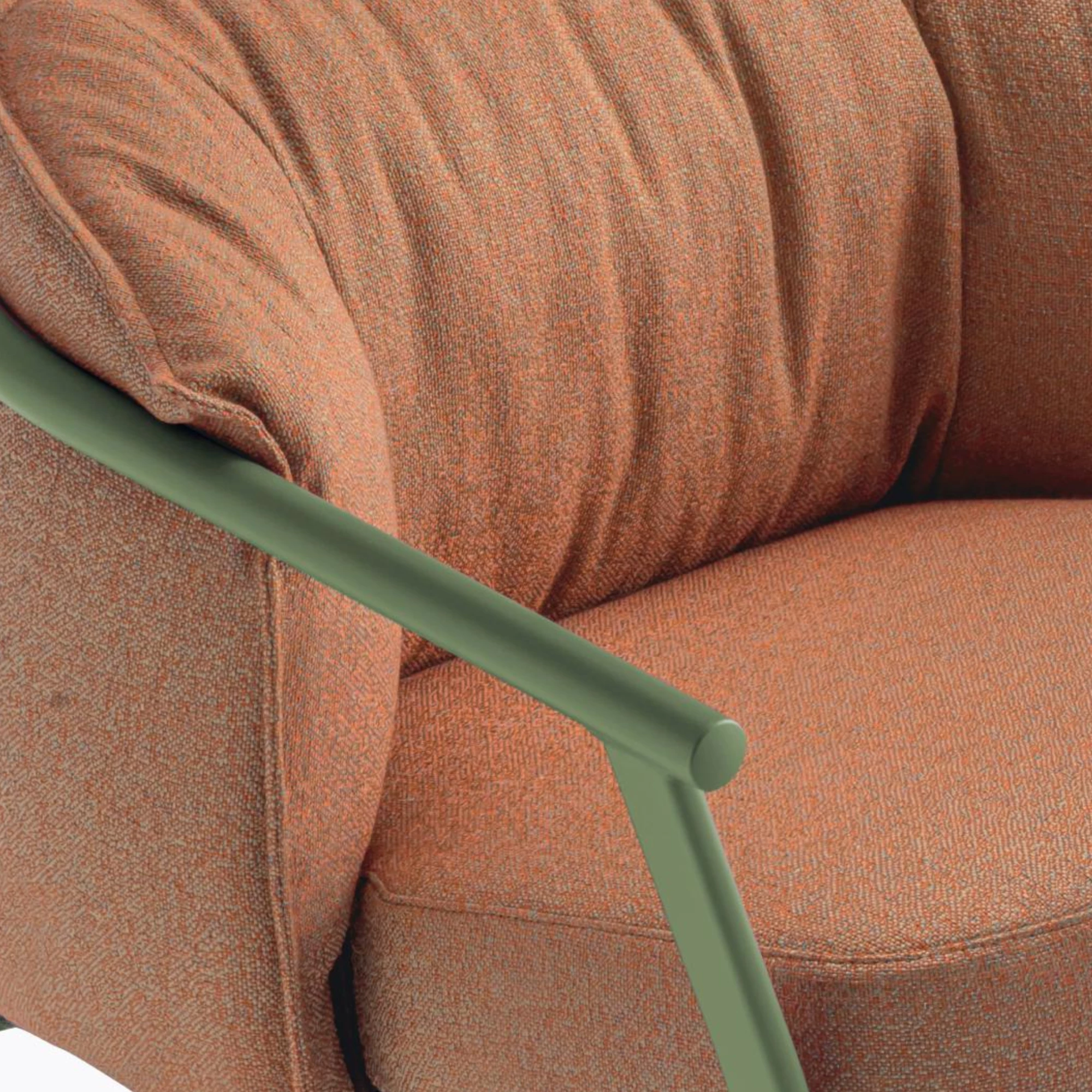 A refined outdoor two-seater designed around a beautiful contrast: a clean, understated frame embracing a soft, generous, and inviting cushion. Its extruded aluminium structure features oval legs seamlessly welded to rounded armrests, creating a sleek and stable silhouette.
