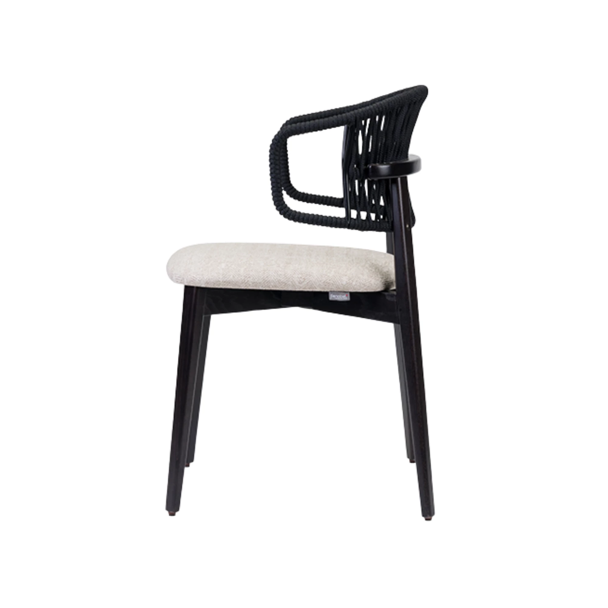 Nebulas is a modern chair with armrests made from durable ash wood. Its standout feature is a beautifully woven cord backrest that combines style and comfort. Designed for horeca venues like restaurants and coffee houses, it offers customizable wood finishes and upholstery colors. High-density foam padding on the seat ensures long-lasting comfort and durability.