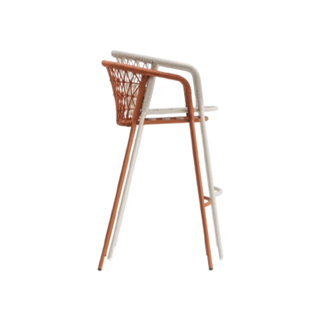 Panarea 3678 is a stylish barstool with a Ø20 mm steel tube frame wrapped in hand-woven Italian polypropylene cord. Its seat cushion, in dry-feel polyurethane foam and matching fabric, offers comfort and durability, making it perfect for terraces, spas, bistros, and restaurant settings.