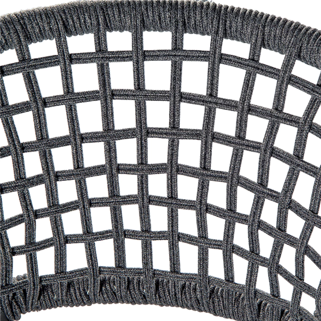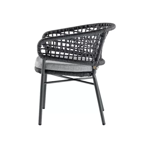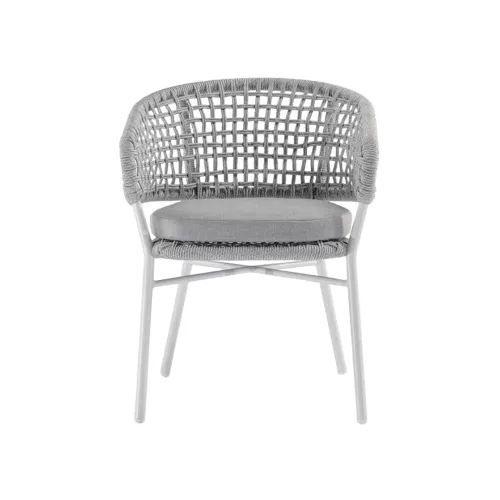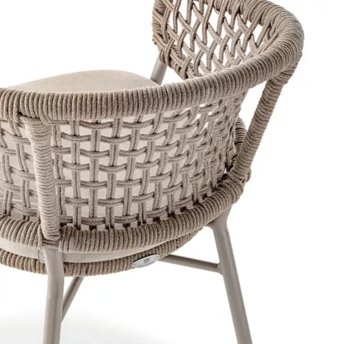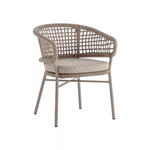 Adon ist ein Outdoor-Stuhl mit Armlehnen aus leichtem Aluminium, umwickelt mit wetterfestem Acrylseil. Das gepolsterte Sitzkissen mit Olefin-Bezug bietet hohen Komfort für den professionellen Einsatz. Der Stuhl ist stapelbar und perfekt geeignet für jede Gastronomie-Terrasse.