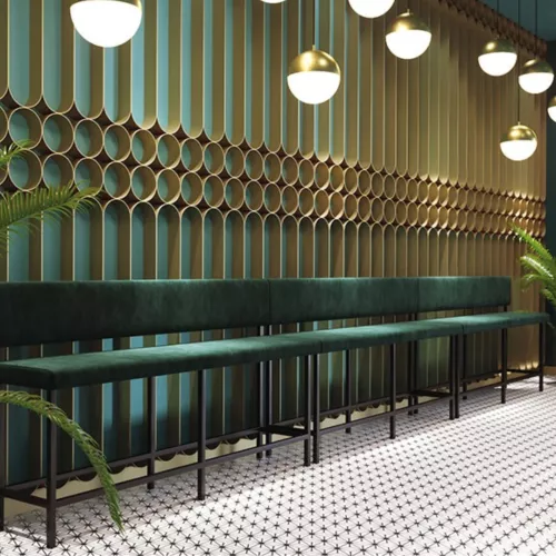 Die Arthur-Bank ist eine hohe Dinerbank mit Metallrahmen, ideal für den Gastronomiebereich. Sie ist in vielen Farben und Dekoren erhältlich und wird individuell nach Ihren Maßangaben gefertigt. Die modulare Polsterbank ist in variablen Größen verfügbar und kann mit zahlreichen Stoffen oder Kunstleder bezogen werden. Sitztiefe: 39 cm. Preis pro Meter.