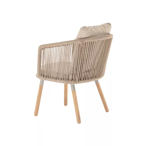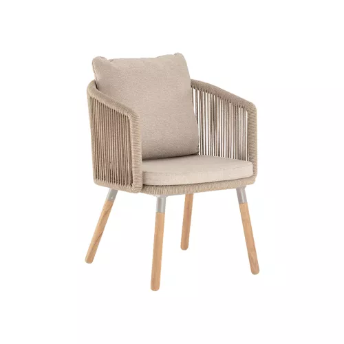 Der Bahamas V ist ein eleganter Outdoor-Armlehnstuhl mit einem stabilen Aluminiumrahmen, der mit Polyesterseil umwickelt ist, und Teakholzbeinen für einen natürlichen Look. Das gepolsterte Sitzkissen aus acrylbeständigem Stoff bietet Komfort und UV-Schutz. Perfekt für jede Horeca-Terrasse im Freien und vielseitig im Design.