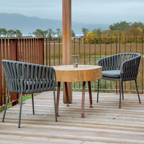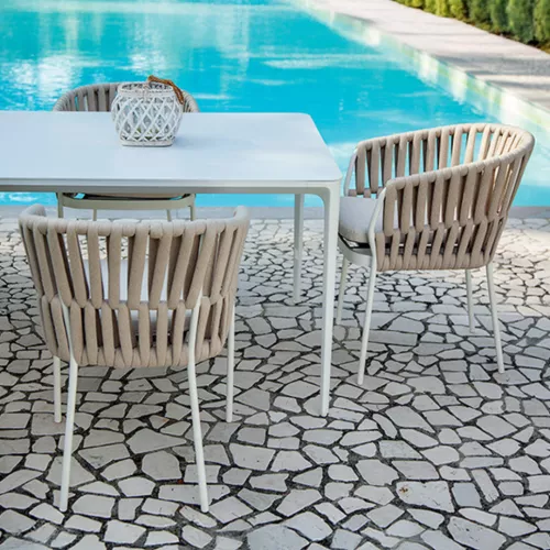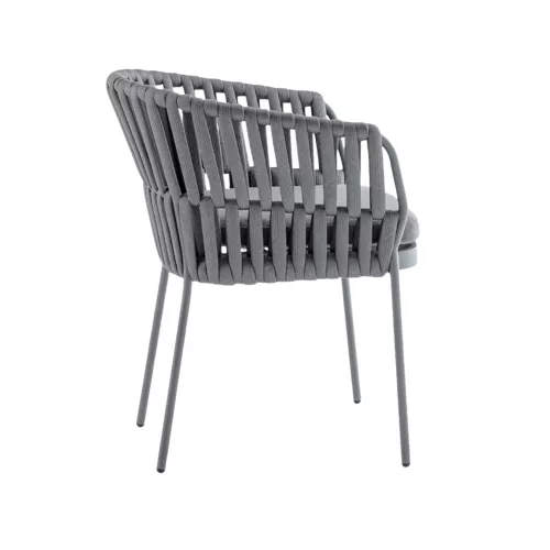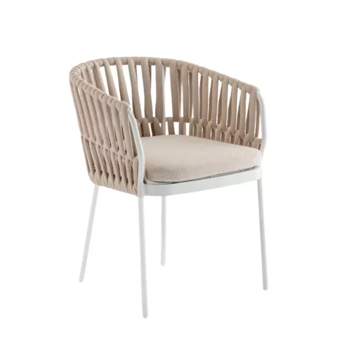 Boho ist ein stabiler und stilvoller Outdoor-Sessel mit Armlehnen, aus Aluminium gefertigt und mit Acrylseil umflochten. Das gepolsterte Kissen mit Olefinbezug sorgt für Komfort. Stapelbar und ideal für jede HoReCa-Terrasse.
