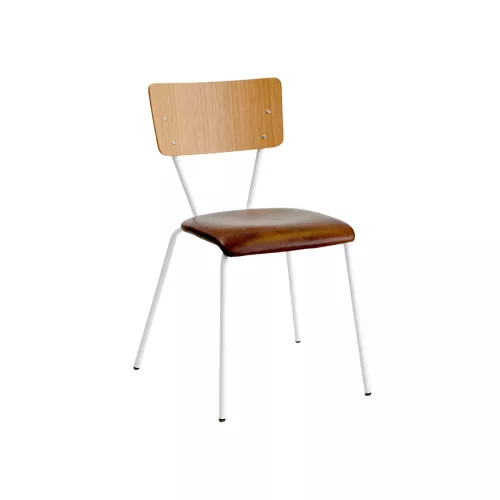 Der Stuhl Clyde kombiniert ein stabiles Metallgestell mit einem Sitz und einer Rückenlehne aus Holz. Das Holz ist in verschiedenen Beiztönen erhältlich, und der Rahmen kann in jeder RAL-Farbe lackiert werden. Eine stilvolle und anpassbare Lösung für den Gastronomiebereich.