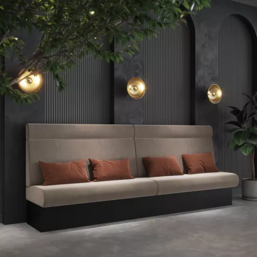 Die Sitzbank Donald + Sockle mit Kopfstütze vereint modernen Komfort mit funktionalem Design – ideal für den Innenbereich von Restaurants. Ausgestattet mit einem stabilen Buchenholzrahmen, Birkenholzbeinen und einem Sockel mit schwarzer oder standard Melaminbeschichtung, garantiert sie stilvolle Langlebigkeit. Die Kopfstütze sorgt für zusätzlichen Komfort, während die Rückseite nicht gepolstert ist – perfekt für Wandlösungen oder feste Installationen. Erhältlich in zwei Größen: 3 m pro 1 m bei ungepolsterter Rückseite, 4 m pro 1 m bei gepolsterter Variante. Donald + Sockle mit Kopfstütze ist die ideale Wahl für Restaurants, Bistros oder Cafés, die auf Qualität, Komfort und Stil setzen.