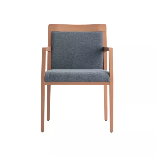 Dubai A ist ein eleganter gepolsterter Stuhl mit Armlehnen sowie gepolsterter Sitzfläche und Rückenlehne. Der Buchenholzrahmen ist mit Polyurethanlack beschichtet und in mehreren Farbtönen erhältlich. Mit Stoff oder Kunstleder bezogen, eignet er sich ideal für Restaurants oder andere HORECA-Bereiche und passt sich durch viele Optionen jedem Designstil an.
