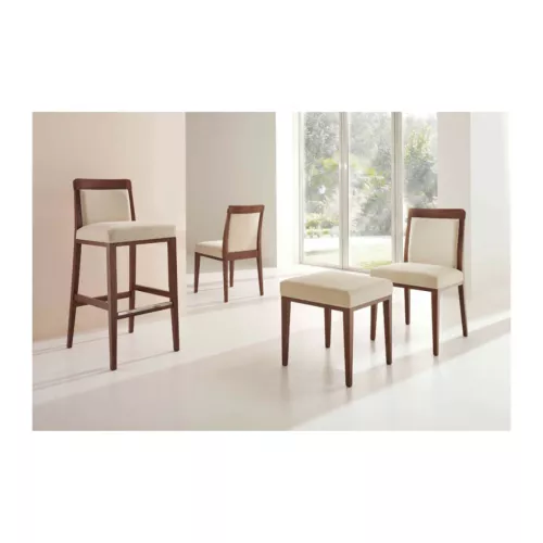 Der Dubai S Stuhl verfügt über einen Buchenholzrahmen, der mit Polyurethanlack beschichtet ist, um eine hohe Widerstandsfähigkeit bei intensiver Nutzung zu gewährleisten. Sitz und Rücken sind gepolstert mit hochdichtem Schaumstoff für langlebigen Komfort. Erhältlich in verschiedenen Holzfarben und mit einer großen Auswahl an professionellen Stoffen oder Kunstleder individuell gestaltbar.