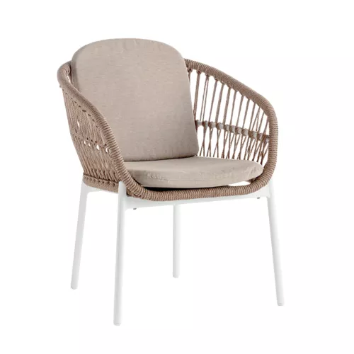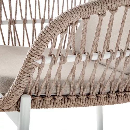 Burl ist ein moderner Outdoor-Stuhl mit Armlehnen, aus robustem Aluminium gefertigt und mit Wintech-Synthetikseil umwickelt. Abnehmbare Kissen mit Olefin-Stoff bieten Komfort und Witterungsbeständigkeit. Perfekt für jede HoReCa-Terrasse.