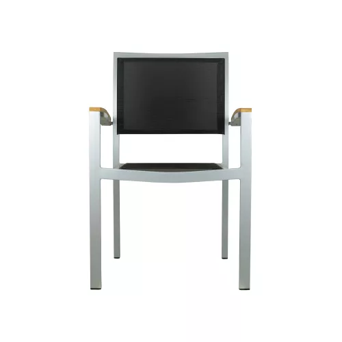 Der George Silver / Black Textilene Stuhl vereint Haltbarkeit und Stil und eignet sich hervorragend für Terrassenrestaurants, Cafés und Bistros. Mit einem robusten Aluminiumrahmen von 22221,8mm, pulverbeschichtet für zusätzliche Haltbarkeit und UV-Beständigkeit, ist er die ideale Wahl für den Außenbereich. Der Textilene Stoff sorgt für hohen Komfort, ist atmungsaktiv und trocknet schnell, um den Gästen maximalen Komfort zu bieten. Die integrierten Armlehnen tragen zur Entspannung und Bequemlichkeit bei. Der Stuhl ist stapelbar und 24 Stühle können pro Einheit gestapelt werden, was ihn ideal für die platzsparende Lagerung in weniger frequentierten Zeiten macht. Ob für die Gestaltung eines modernen Außenbereichs oder die Aufwertung eines bestehenden Raumes – der George Silver / Black Textilene Stuhl kombiniert Funktionalität, Komfort und zeitloses Design.