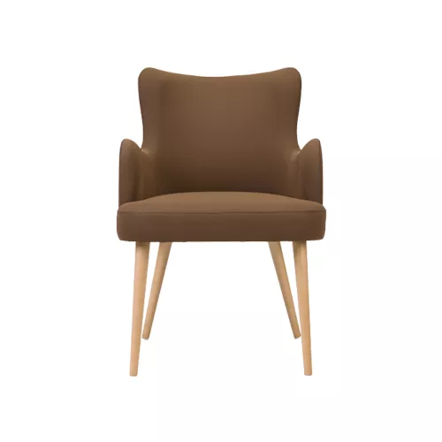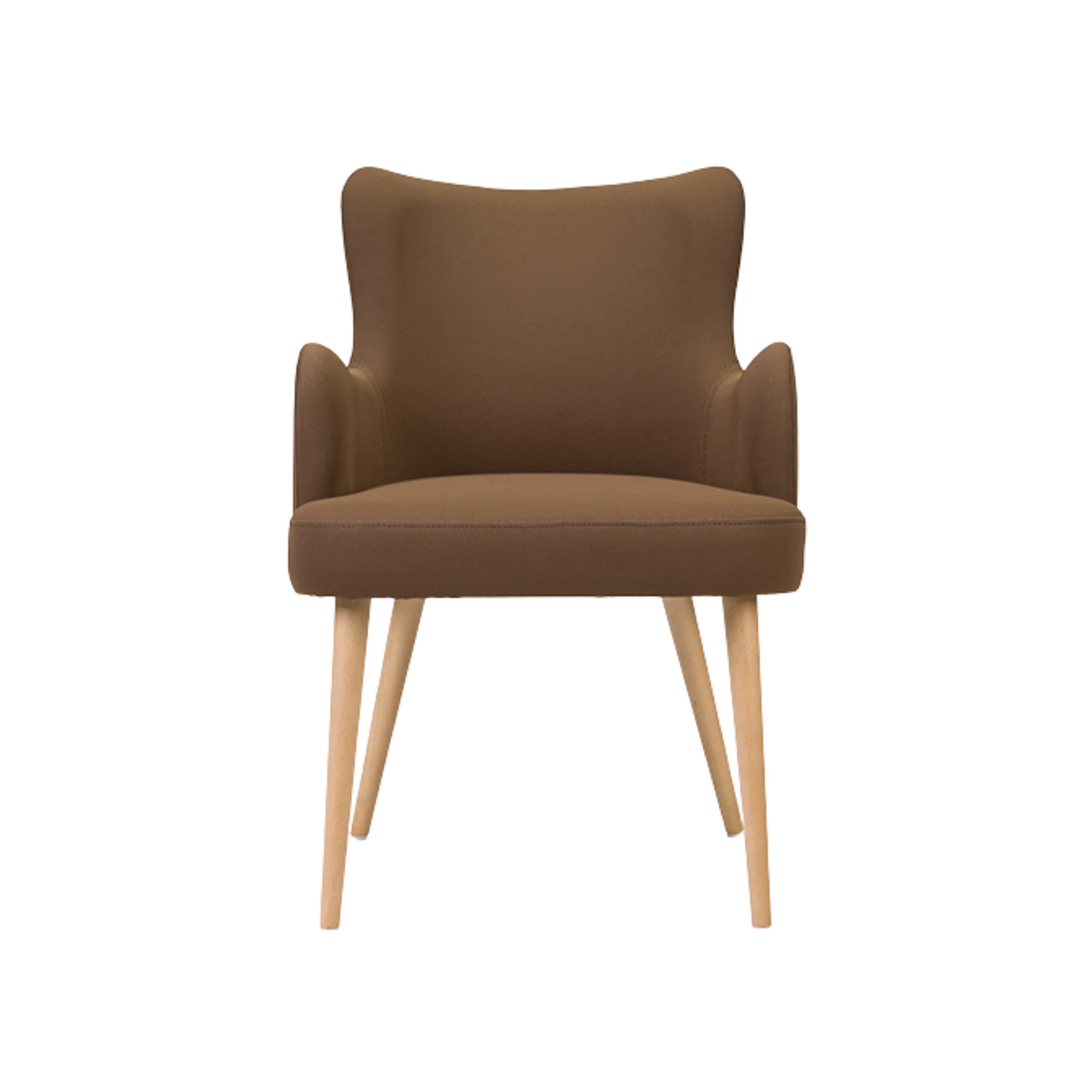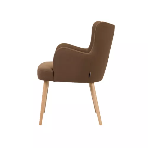 Kelly Flow ist ein Holzstuhl mit Armlehnen im eleganten Mid-Century-Stil. Der Rahmen besteht aus massiver Buche in verschiedenen Beizfarben. Sitz und Rücken sind mit professionellen Stoffen oder Kunstleder gepolstert – perfekt für HORECA-Einsätze.