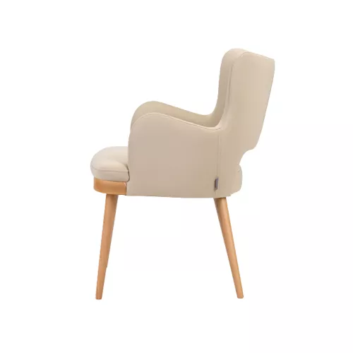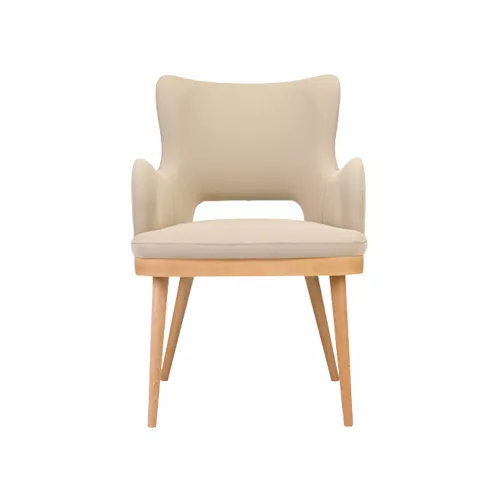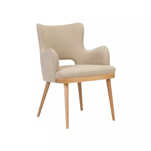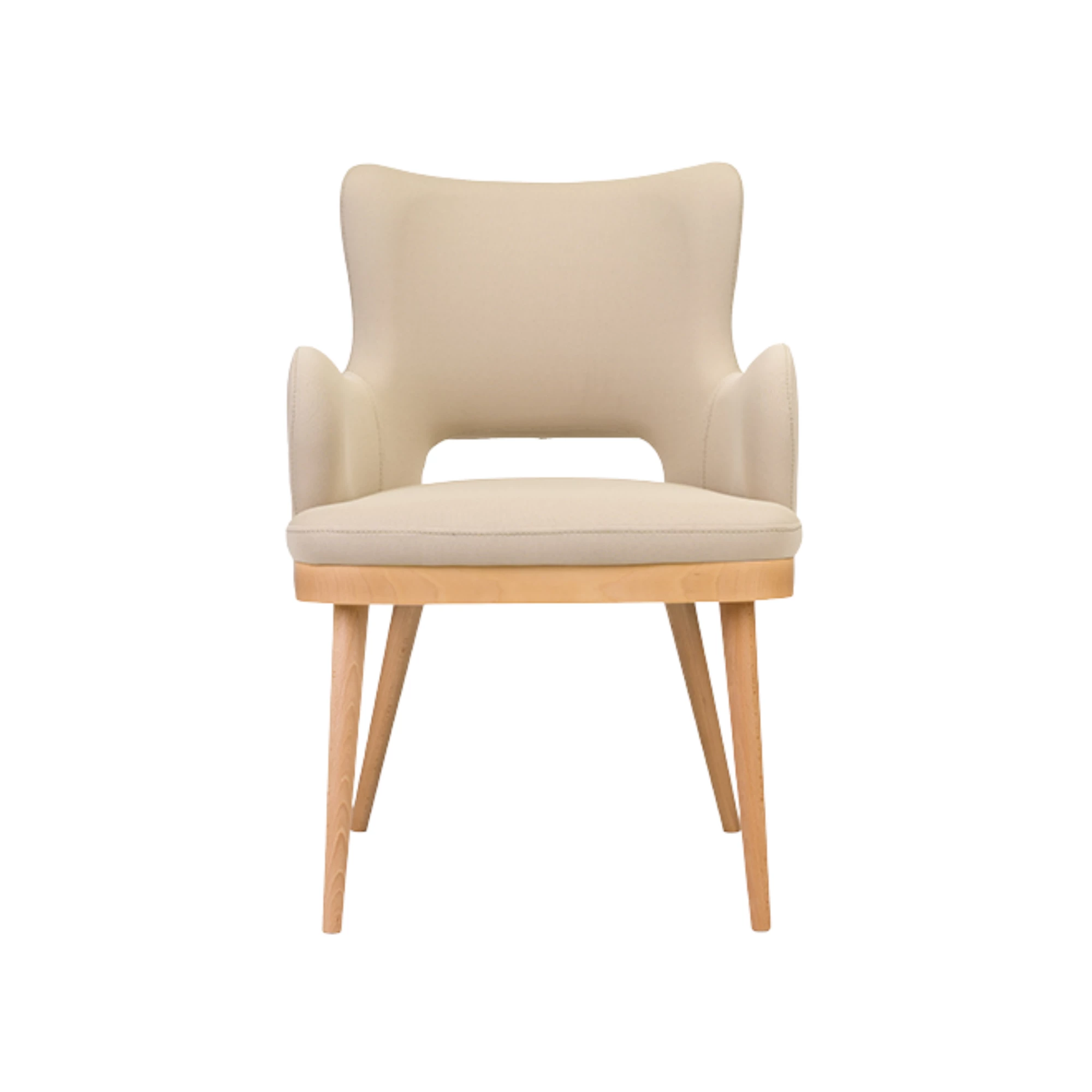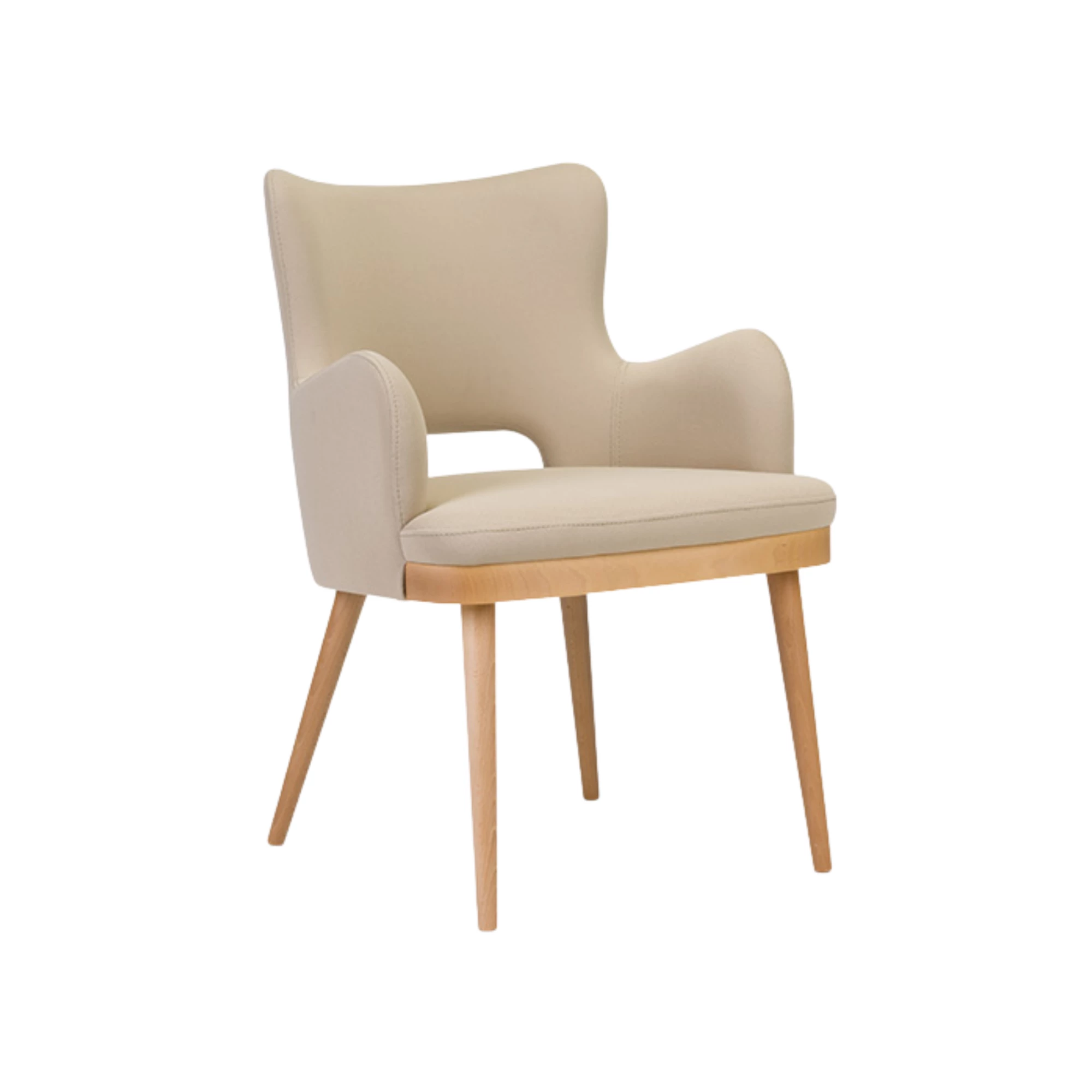 Kelly Flow Hole ist ein Holzstuhl mit Armlehnen und charakteristischem Rückenausschnitt. Das Buchenholzgestell ist in mehreren Beiztönen erhältlich, kombiniert mit einer voll gepolsterten Sitzfläche und Rückenlehne. Perfekt für den HORECA-Bereich mit Mid-Century-Flair.