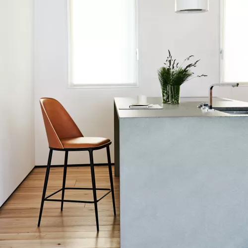 Ein zeitloser Hocker mit schlankem vierbeinigem Metallgestell und edlem Lederbezug. Sitz und Rückenlehne sind mit hochwertigem Leder oder luxuriösem toskanischem Leder bezogen und bieten so Langlebigkeit und Eleganz. Mit einer Höhe von H75 eignet sich dieser Hocker perfekt für Bartheken und elegante Gastronomiebereiche, die einen Hauch italienischer Handwerkskunst suchen.