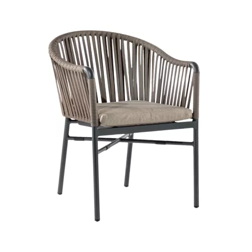 Entdecken Sie Mason, einen stilvollen, stapelbaren Outdoor-Armlehnstuhl aus robustem Aluminium. Mit einem anthrazitfarbenen Rahmen, umwickelt mit taupefarbenem Textylen-Seil und Ecowicker, verbindet er modernes Design mit wetterfesten Materialien. Das gepolsterte Sitzkissen aus braunem Olefin sorgt für Komfort. Perfekt für jede Outdoor-Horeca-Terrasse.