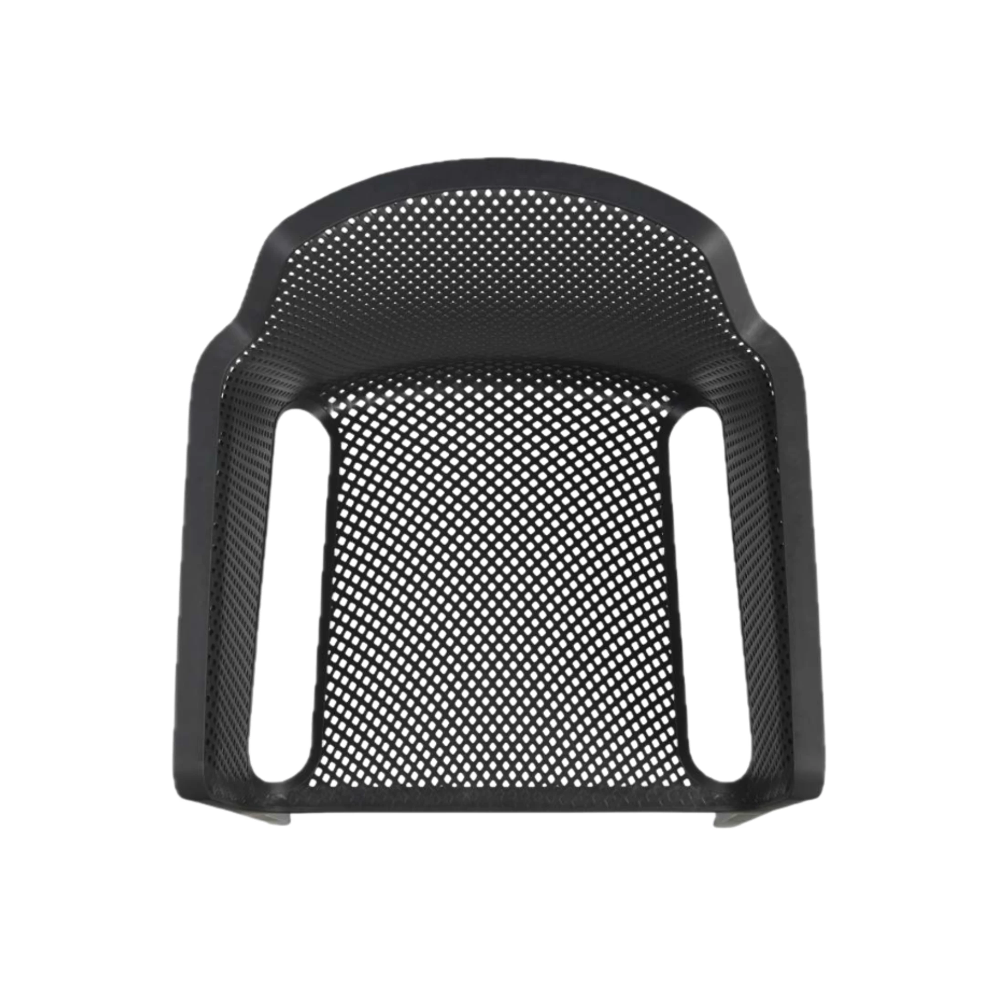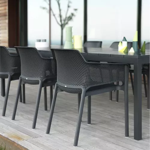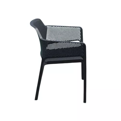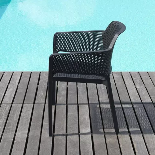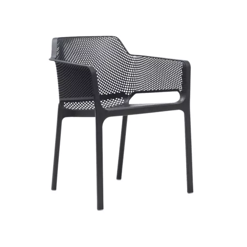 Net ist ein moderner Outdoor-Stuhl für den HORECA-Bereich mit Monoblock-Polypropylenrahmen und Armlehnen. Sitz und Rücken sind mit einem radialen Muster aus quadratischen Perforationen versehen. Wetter- und UV-beständig, matte Oberfläche, in mehreren Farben erhältlich.