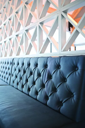 Die Paolo Bench ist eine maßgefertigte Restaurantbank mit Sockel und Nosag-Federn, die für Langlebigkeit und Komfort sorgt. Die Polsterung aus hochdichtem Schaumstoff bietet langfristige Beständigkeit. Sie ist in vielen Stoff- oder Kunstlederoptionen erhältlich und kann individuell nach Kundenwunsch produziert werden.