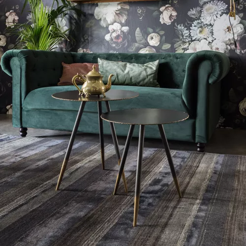 Das Stalwart S/M Set besteht aus zwei Beistelltischen, die industriellen Charme mit Eleganz verbinden. Die 3 mm starken Tischplatten aus pulverbeschichtetem Gunmetal-Eisen mit goldfarben geschweißten Kanten schaffen Kontraste. Beine mit goldenen Füßen runden das Design ab. Maße: S – Ø40×44 cm, M – Ø45×50 cm. Ideal für stilvolle Horeca-Umgebungen.