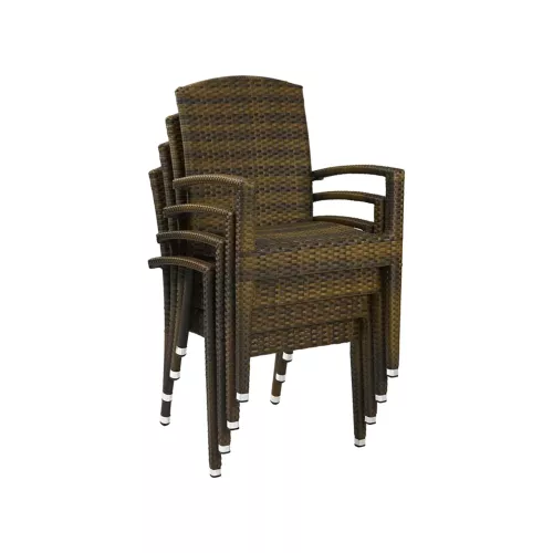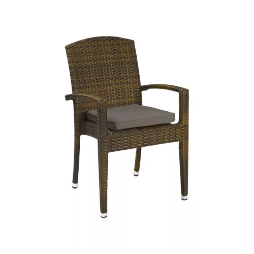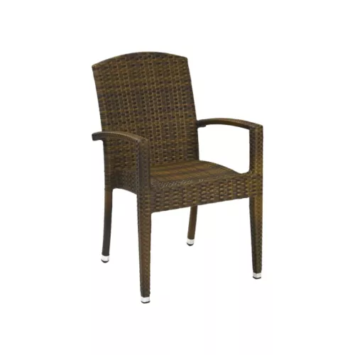Titus Brown A ist ein Outdoor-Stuhl mit Armlehnen und pulverbeschichtetem Aluminiumrahmen. Sitz und Rücken bestehen aus flachem P.E.-Wicker in verbrannter Farbe. UV- und wetterbeständig, stapelbar bis zu 8 Stück. Perfekt für jede Außen-Horeca-Umgebung. Optional ist ein wasserabweisendes Sitzkissen erhältlich.